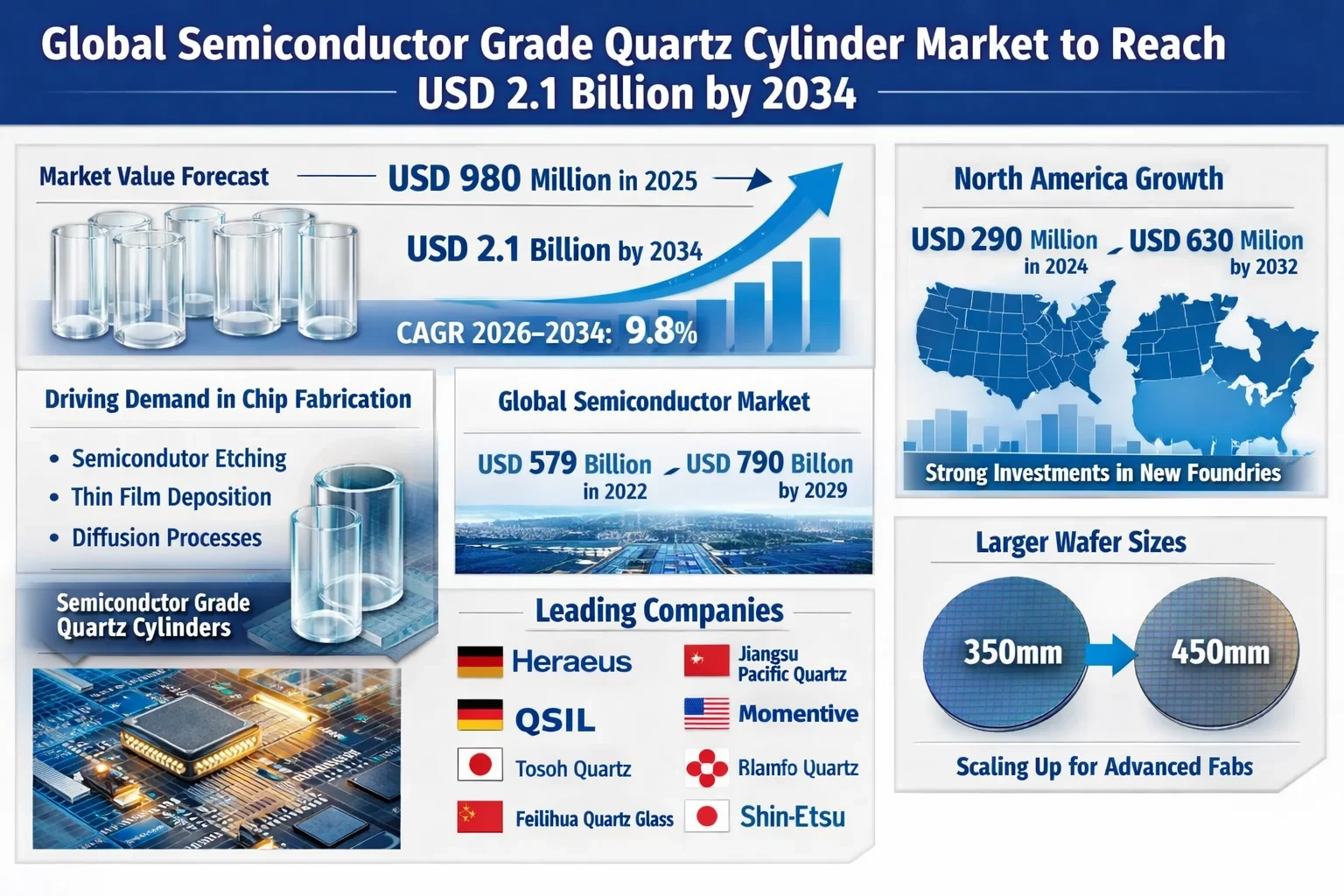 Global Semiconductor Grade Quartz Cylinder Market, valued at USD 980 million in 2025, is on a high-growth trajectory to reach USD 2.1 billion by 2034. According to the latest strategic analysis from Semiconductor Insight, this expansion represents a compound annual growth rate (CAGR) of 9.8% during the forecast period of 2026–2034.