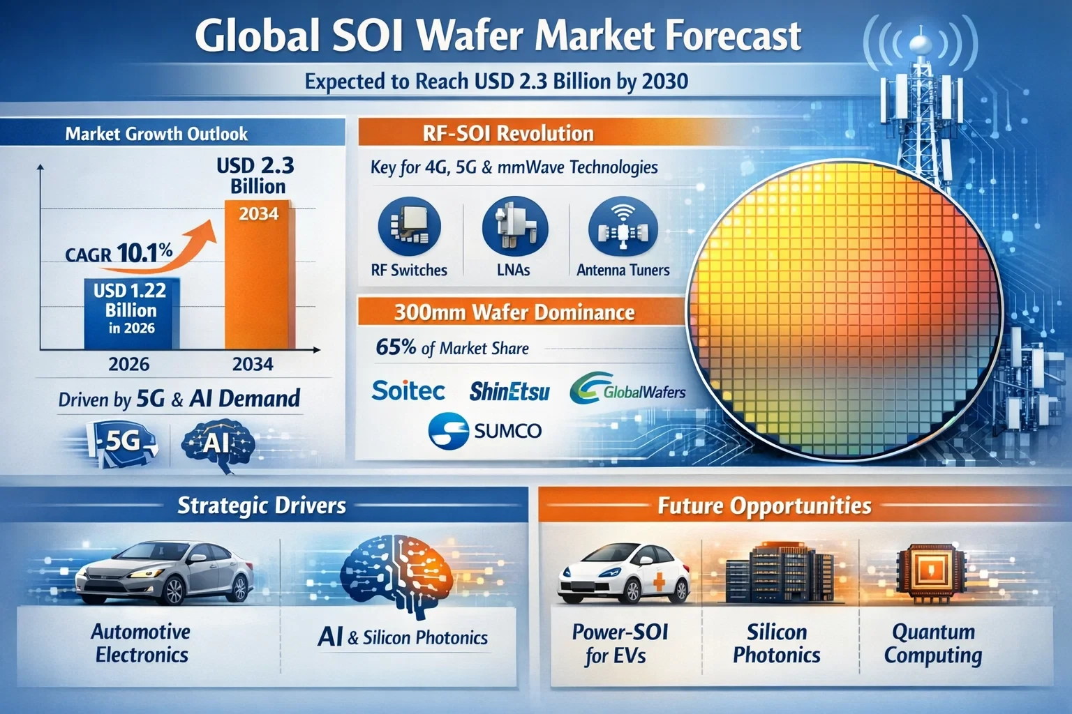 Global Silicon on Insulator (SOI) Wafer Market, valued at USD 1,223 million in 2026, is projected to reach an impressive USD 2,308 million by 2034. This growth, moving at a compound annual growth rate (CAGR) of 10.1%, highlights a critical shift in semiconductor architecture as industries demand higher performance and lower power consumption for next-generation electronics.