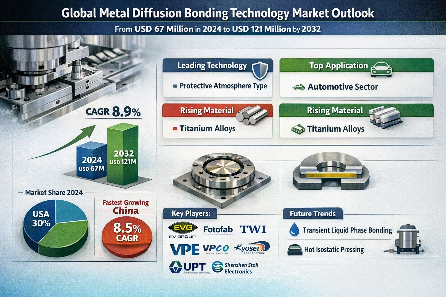 Global Metal Diffusion Bonding Technology Market, valued at USD 67 million in 2024, is projected to reach USD 121 million by 2032, growing at a steady compound annual growth rate (CAGR) of 8.9%. According to the latest strategic analysis from Semiconductor Insight, this growth reflects an increasing reliance on advanced joining technologies that offer superior mechanical integrity for critical industrial components.