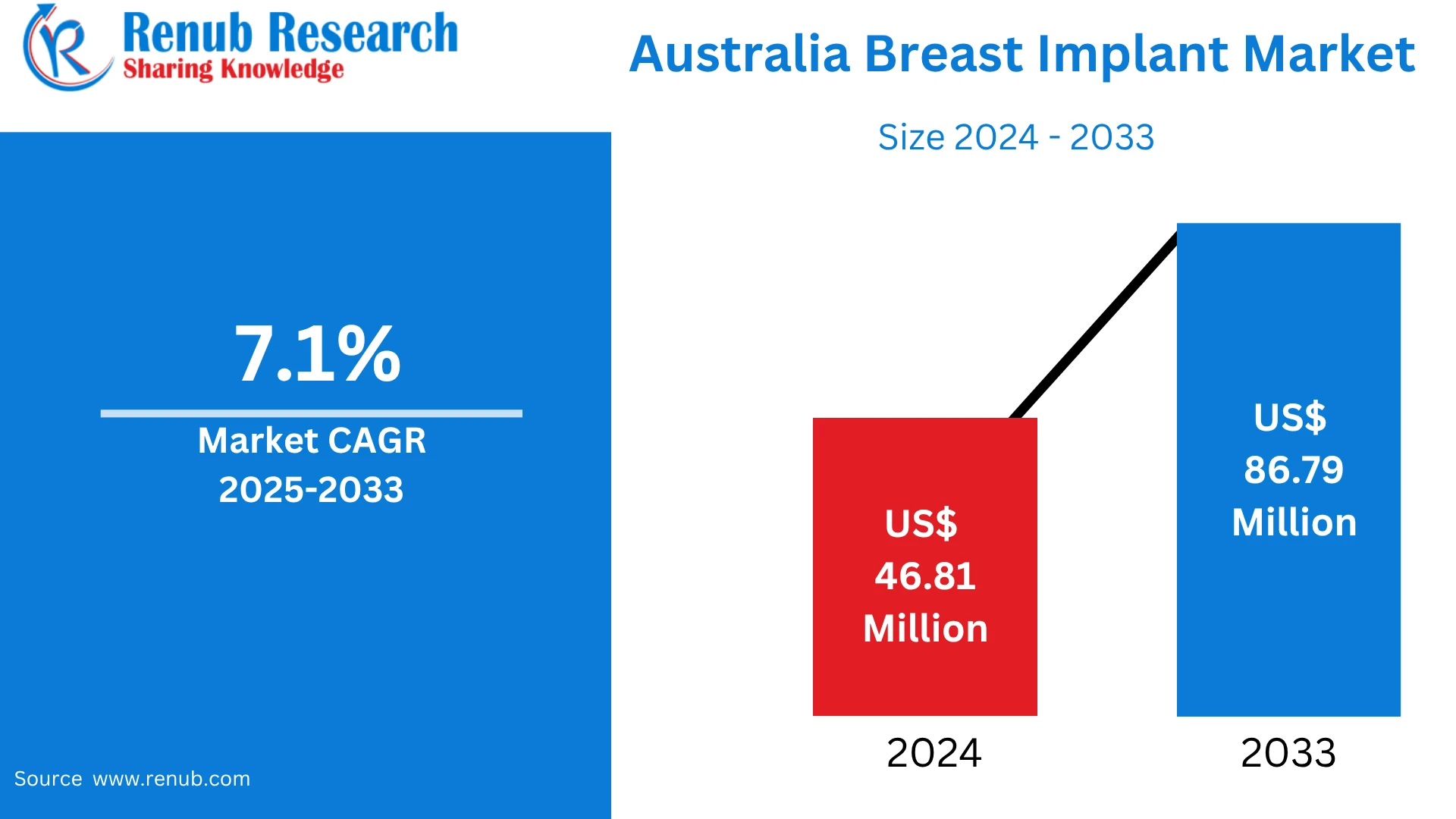 According To Renub Research Australia breast implant market is experiencing steady and sustained expansion, supported by changing social attitudes, medical innovation, and rising demand for both cosmetic and reconstructive procedures. The market value, estimated at US$ 46.81 million in 2024, is projected to reach approximately US$ 86.79 million by 2033, growing at a compound annual growth rate of around 7.1% during the forecast period from 2025 to 2033. This growth reflects the increasing acceptance of aesthetic procedures, improved implant safety standards, and a stronger focus on personal appearance and post-surgical reconstruction across the country.