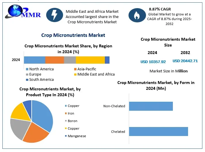 The size of the crop micronutrients market was estimated at USD 10357.92 million in 2024, and it is anticipated that the total revenue from crop micronutrients will increase at a compound annual growth rate (CAGR) of 8.87% from 2025 to 2032, to reach over USD 20442.71 million.