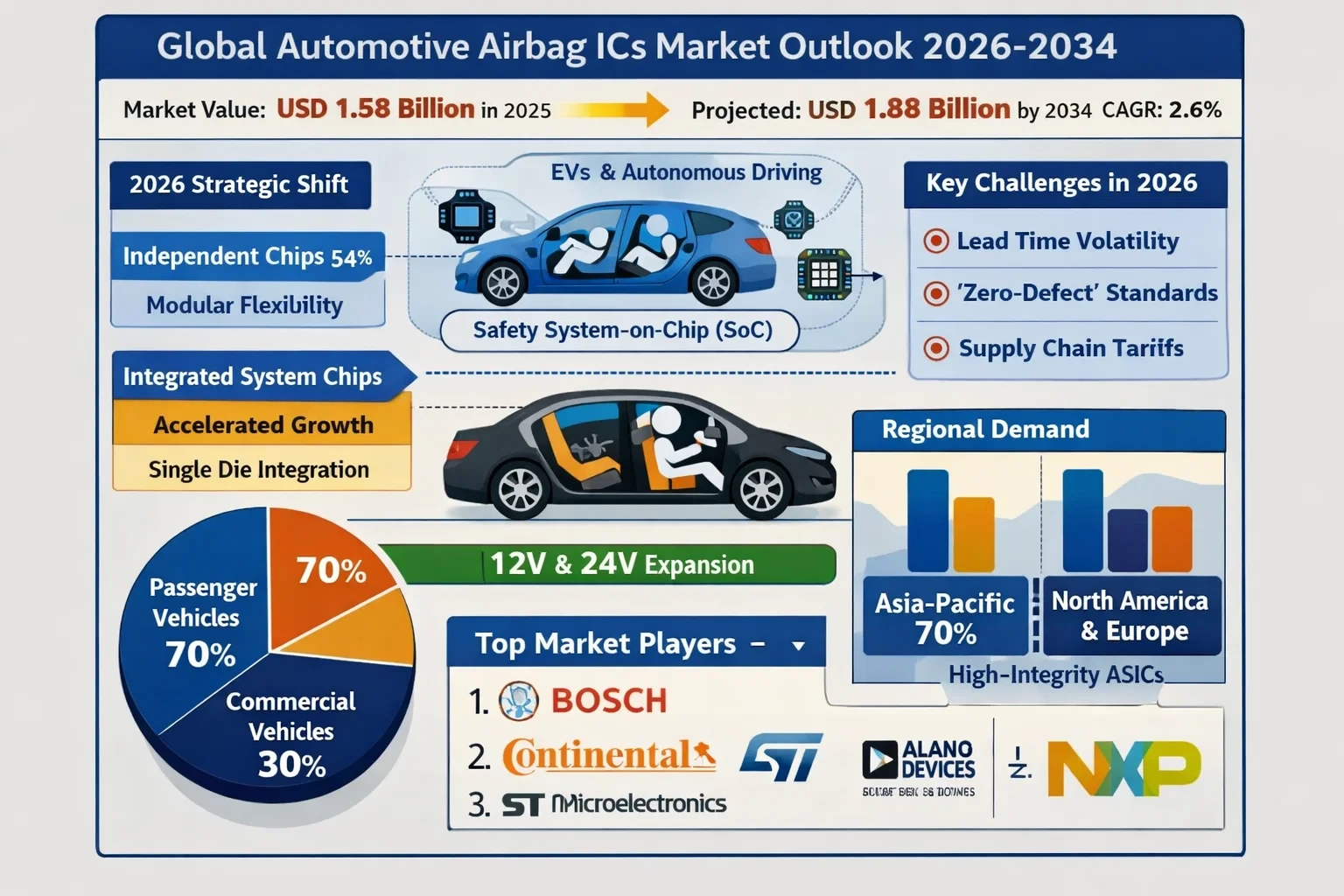 Global Automotive Airbag ICs (Integrated Circuits) Market, valued at USD 1.58 billion in 2025, is projected to reach USD 1.88 billion by 2034. As of early 2026, the industry is transitioning through a critical growth phase. While the market maintains a steady CAGR of 2.6%, the underlying complexity of the silicon is increasing rapidly as vehicle manufacturers move toward "software-defined" safety architectures.