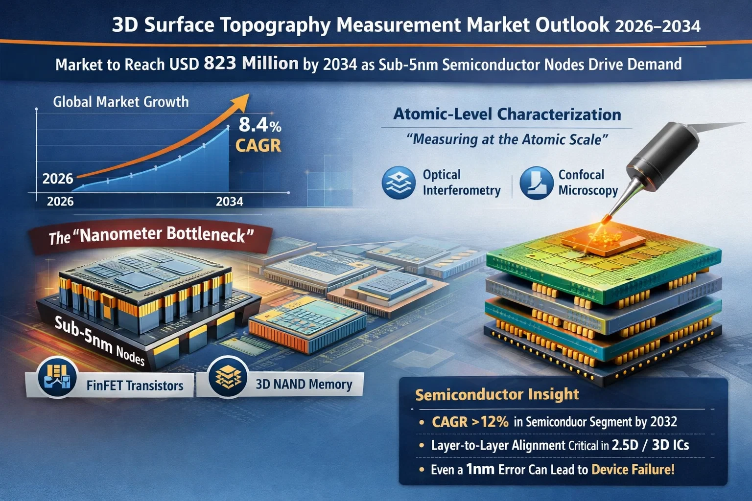 Global 3D Chips (3D IC) Market, valued at USD 14.73 billion in 2026, is projected to reach an exponential USD 43.87 billion by 2034. This growth, moving at a powerful compound annual growth rate (CAGR) of 14.62%, signals a paradigm shift in semiconductor manufacturing as the industry moves beyond traditional 2D architectures to overcome physical scaling limits.