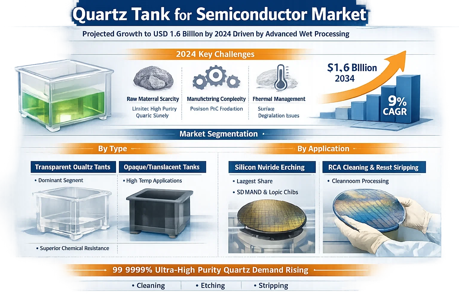 Global Quartz Tank for Semiconductor Market, valued at USD 760 million in 2026, is on a trajectory to reach USD 1.6 billion by 2034, growing at a CAGR of 9%. This growth is a direct reflection of the surging demand for ultra-high-purity vessels required for critical semiconductor "wet" stages, including cleaning, etching, and stripping.
