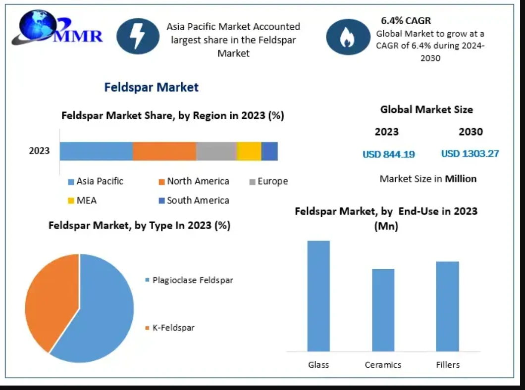 Feldspar Market was valued at USD 844.19 Mn in 2023 and is expected to reach USD 1303.27 Mn by 2030 at a CAGR of 6.4% during a forecast period.