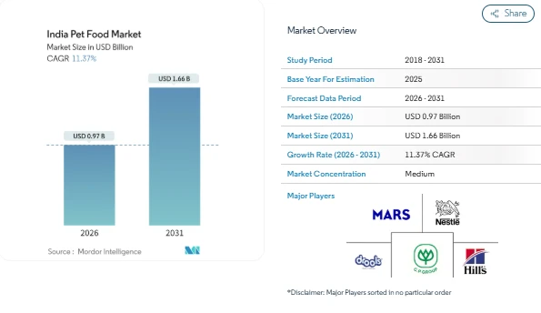 The India Pet Food Market is entering a high-growth phase, driven by rising urban pet adoption, changing household structures, and increasing awareness of scientifically balanced pet nutrition. According to industry analysis, the India Pet Food Market Size is valued at USD 0.97 billion in 2026 and is forecasted to reach USD 1.66 billion by 2031, expanding at a compound annual growth rate of 11.37% during the forecast period.
