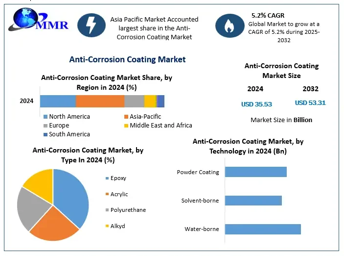 The size of the anti-corrosion coating market was estimated at USD 35.53 billion in 2024, and it is anticipated that overall anti-corrosion coating revenue will increase at a compound annual growth rate (CAGR) of 5.2% between 2025 and 2032, to reach almost USD 53.31 billion.