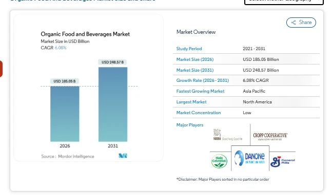 The Organic Food and Beverages Market size continues to gain steady attention as consumers increasingly align everyday food choices with health, safety, and environmental responsibility. According to Mordor Intelligence, the market is estimated to reach USD 185.05 billion by 2026 and is forecast to grow to USD 248.57 billion by 2031. This expansion reflects consistent demand across both developed and emerging regions, supported by rising trust in certified organic products and their role in regular diets.