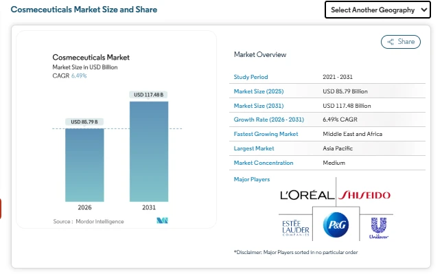 The Cosmeceuticals Market sits at the intersection of cosmetics and dermatology, offering products that focus on appearance while supporting skin and hair health through active ingredients. According to Mordor Intelligence, the Cosmeceuticals Market Size is estimated at USD 85.79 billion in 2026 and is forecast to reach USD 117.48 billion by 2031. This growth reflects a steady shift in consumer priorities, where skincare and haircare routines are no longer driven only by beauty aspirations but also by preventive care and visible results.