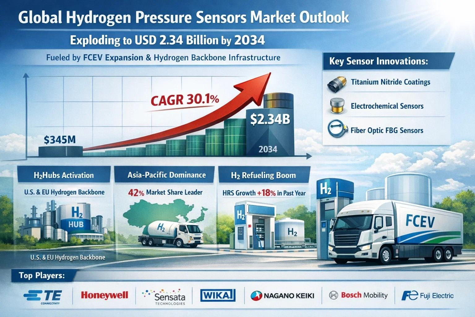 Global Hydrogen Pressure Sensors Market, valued at USD 345 million in 2026, is projected to reach an unprecedented USD 2.34 billion by 2034. According to a 2026 strategic analysis from Semiconductor Insight, the market is growing at a massive CAGR of 30.1%, fueled by the aggressive expansion of Fuel Cell Electric Vehicle (FCEV) fleets and the rollout of global hydrogen infrastructure.