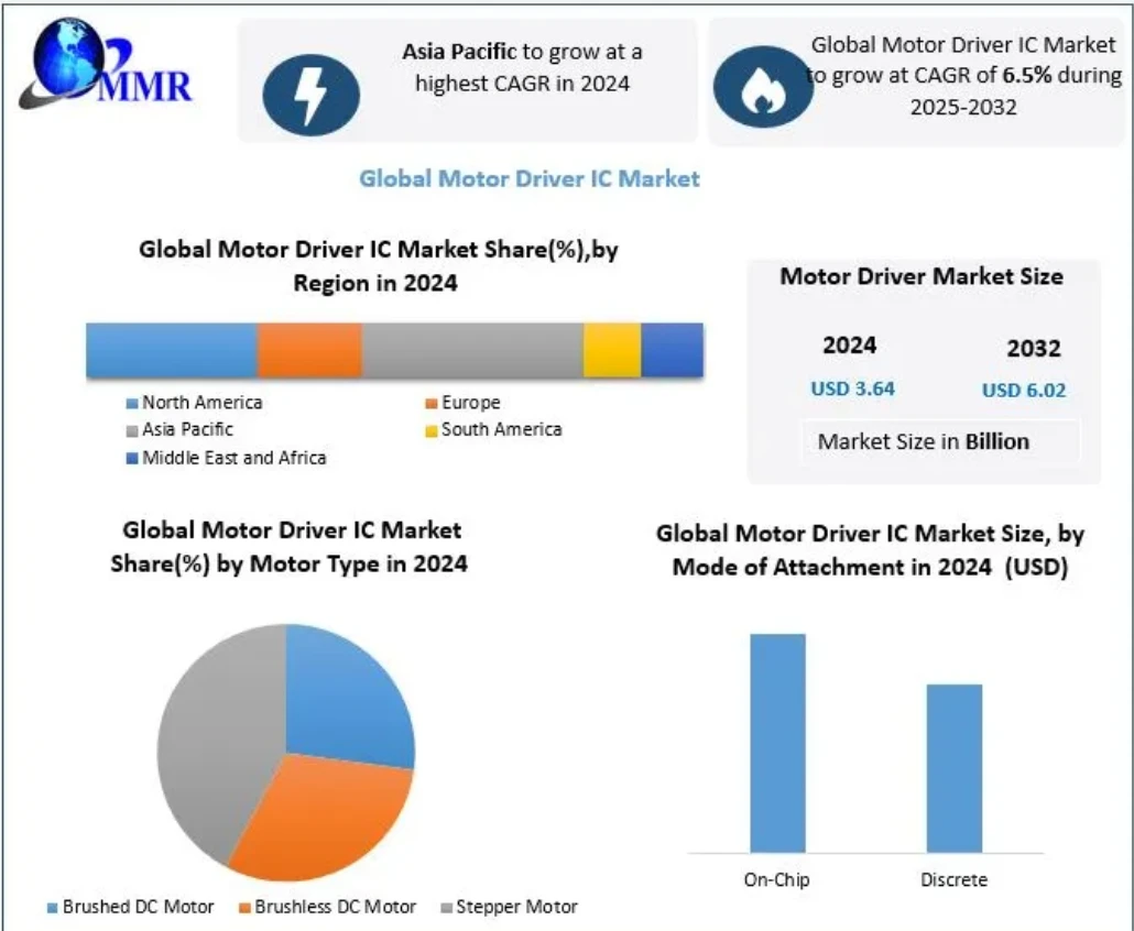 Motor Driver IC Market was valued at USD 3.64 Bn. in 2024 and the total revenue of Global Motor Driver IC Market is expected to grow at CAGR of 6.5% from 2025 to 2032 reaching nearly 6.02 Bn. by 2032