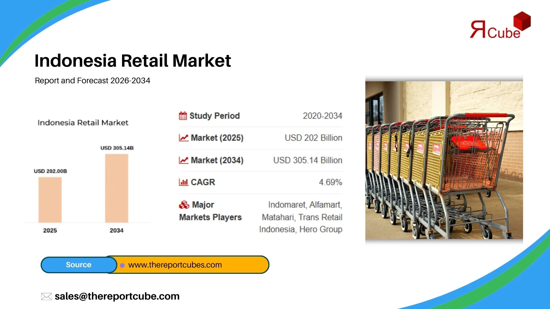 According to The Report Cube, Indonesia Retail Market Research Report (2026–2034), the market reached an estimated value of USD 202 Billion in 2025. Based on current industry structure and observed demand patterns, the market is forecast to reach USD 305.14 Billion by 2034, expanding at a compound annual growth rate (CAGR) of 4.69%. Over the forecast period 2026-2034