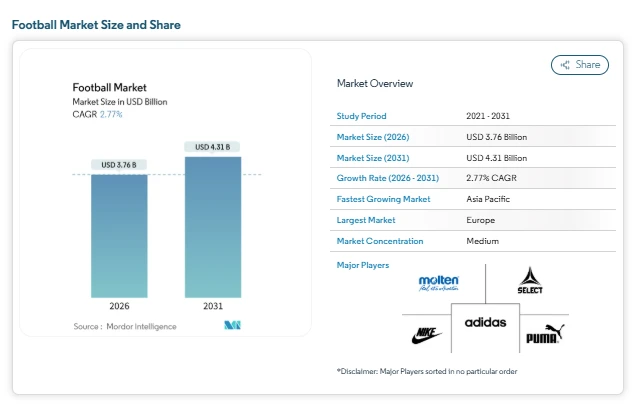 The Football Market continues to show steady expansion as the sport maintains its position as the world’s most widely played and watched game. According to Mordor Intelligence, the Football Market Size reached USD 3.76 billion in 2026 and is forecast to grow to USD 4.31 billion by 2031, supported by consistent demand from professional leagues, grassroots programs, and recreational players. While growth remains moderate, the market benefits from football’s deep cultural roots, year-round participation, and strong institutional backing.