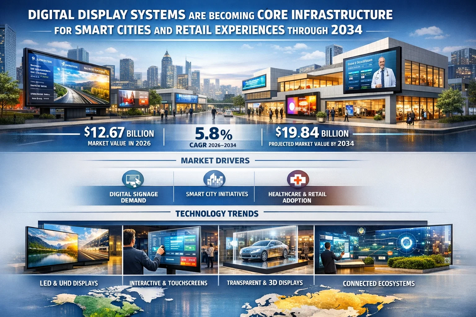 global Digital Display System market is rapidly evolving from a visual communication tool into a foundational component of modern urban, commercial, and healthcare infrastructure. Valued at 12.67 billion in 2026, the market is projected to reach 19.84 billion by 2034, expanding at a CAGR of 5.8 percent during the forecast period 2026–2034.