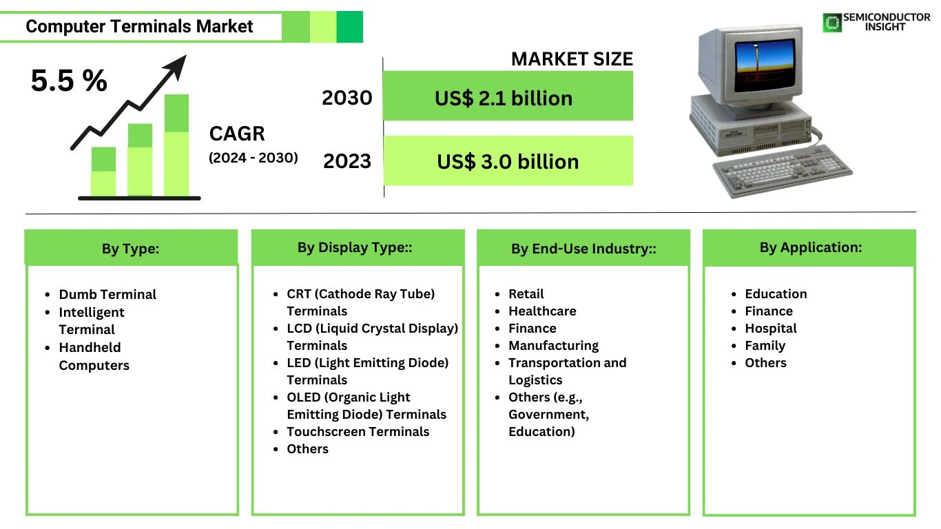 Computer terminals are devices used to input, access, and display data within computer systems and networks. These systems typically include input interfaces such as keyboards or touchscreens and output displays that allow users to interact with centralized or distributed computing resources. Modern terminals range from traditional hardware terminals to intelligent, handheld, and virtual software-based terminal interfaces used across retail, healthcare, finance, manufacturing, and education environments.