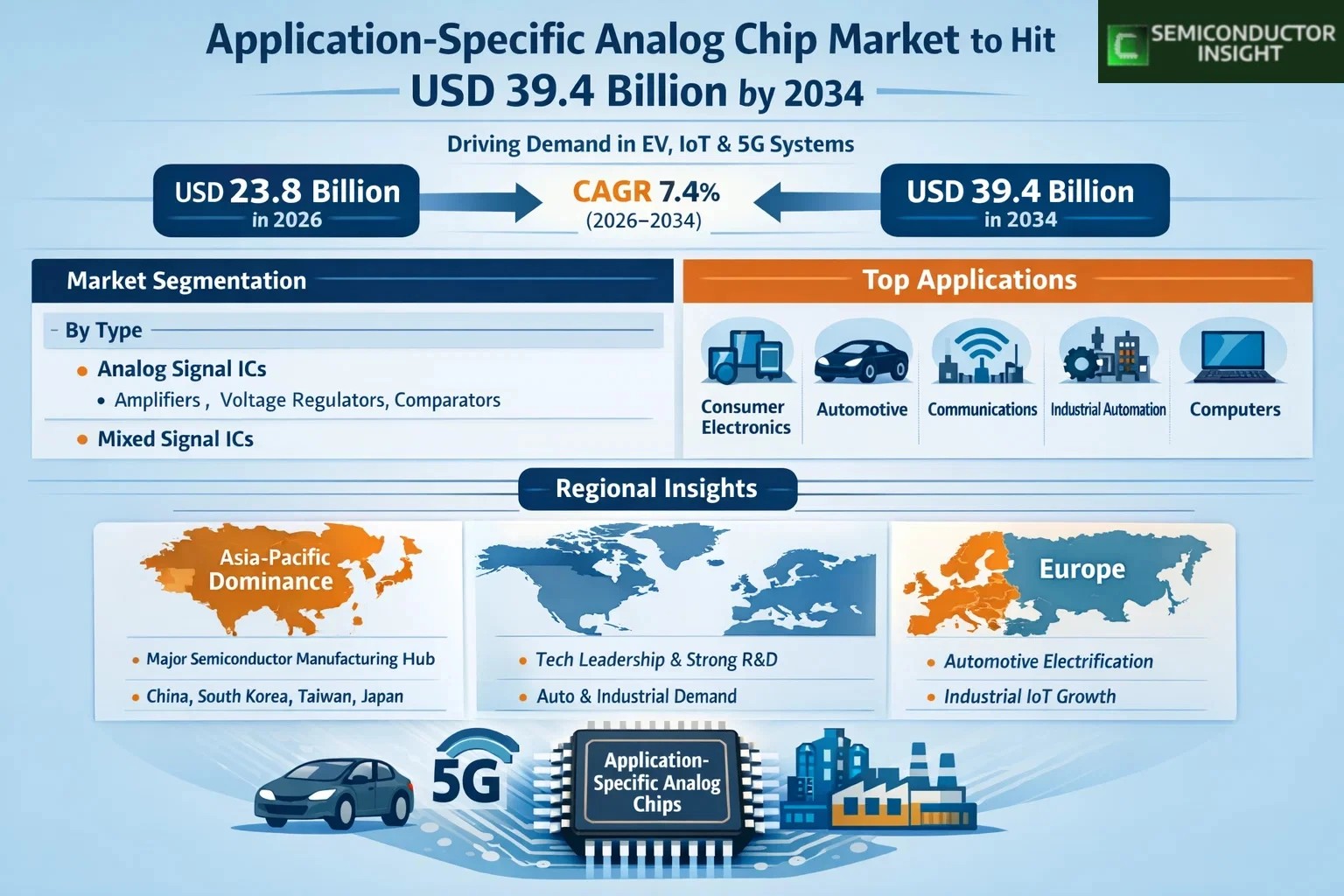 global Application-Specific Analog Chip Market size was valued at USD 23.8 billion in 2026 and is projected to reach USD 39.4 billion by 2034, at a CAGR of 7.4% during the forecast period 2026–2034. Market growth is being supported by rising deployment of customized analog and mixed-signal ICs across consumer electronics, automotive platforms, communications infrastructure, and industrial automation systems, where precision signal processing and power efficiency remain mission-critical.