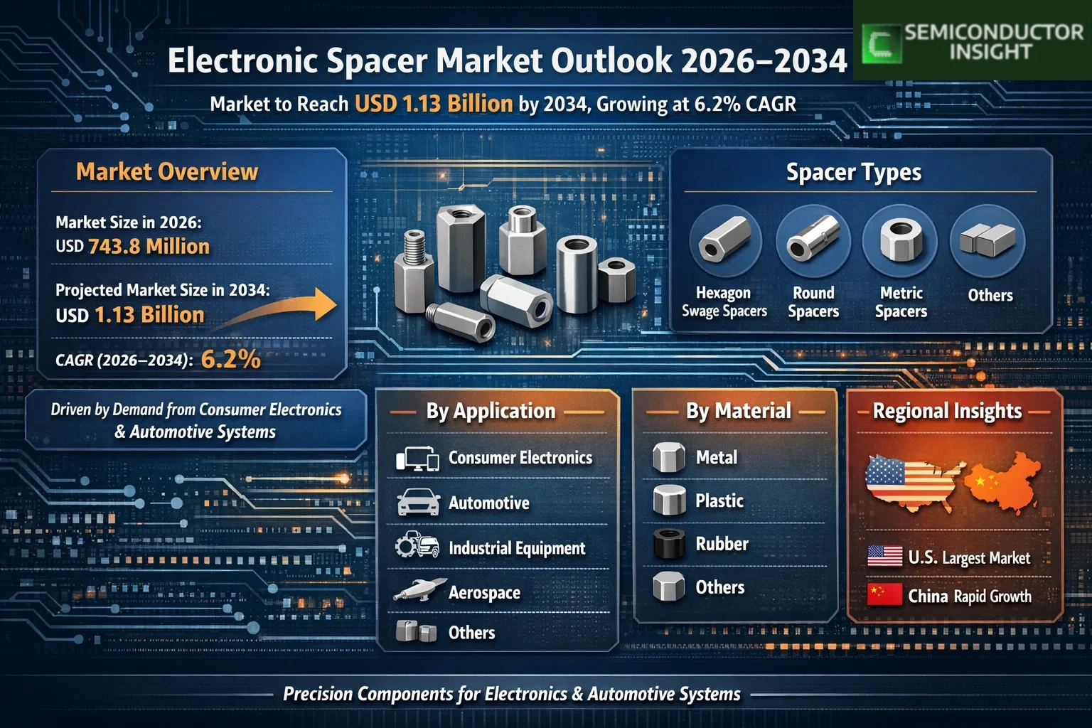 Global Electronic Spacer Market was valued at USD 743.8 million in 2026 and is projected to reach USD 1.13 billion by 2034, expanding at a CAGR of 6.2% during the forecast period 2026–2034. Market growth is being supported by sustained expansion in consumer electronics manufacturing, increasing electronics content in vehicles, and rising requirements for precision mechanical support in compact assemblies. While the U.S. currently leads in market size, China’s accelerating electronics production ecosystem is creating strong long-term growth opportunities for spacer suppliers worldwide.