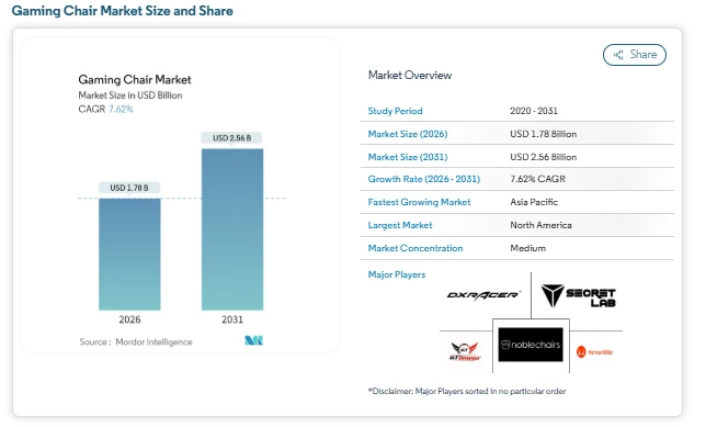 The gaming chair market size is expected to increase from USD 1.65 billion in 2025 to USD 1.78 billion in 2026 and is projected to reach USD 2.56 billion by 2031 at 7.62% CAGR, reflecting steady market growth supported by expanding digital gaming participation and ergonomic seating demand.