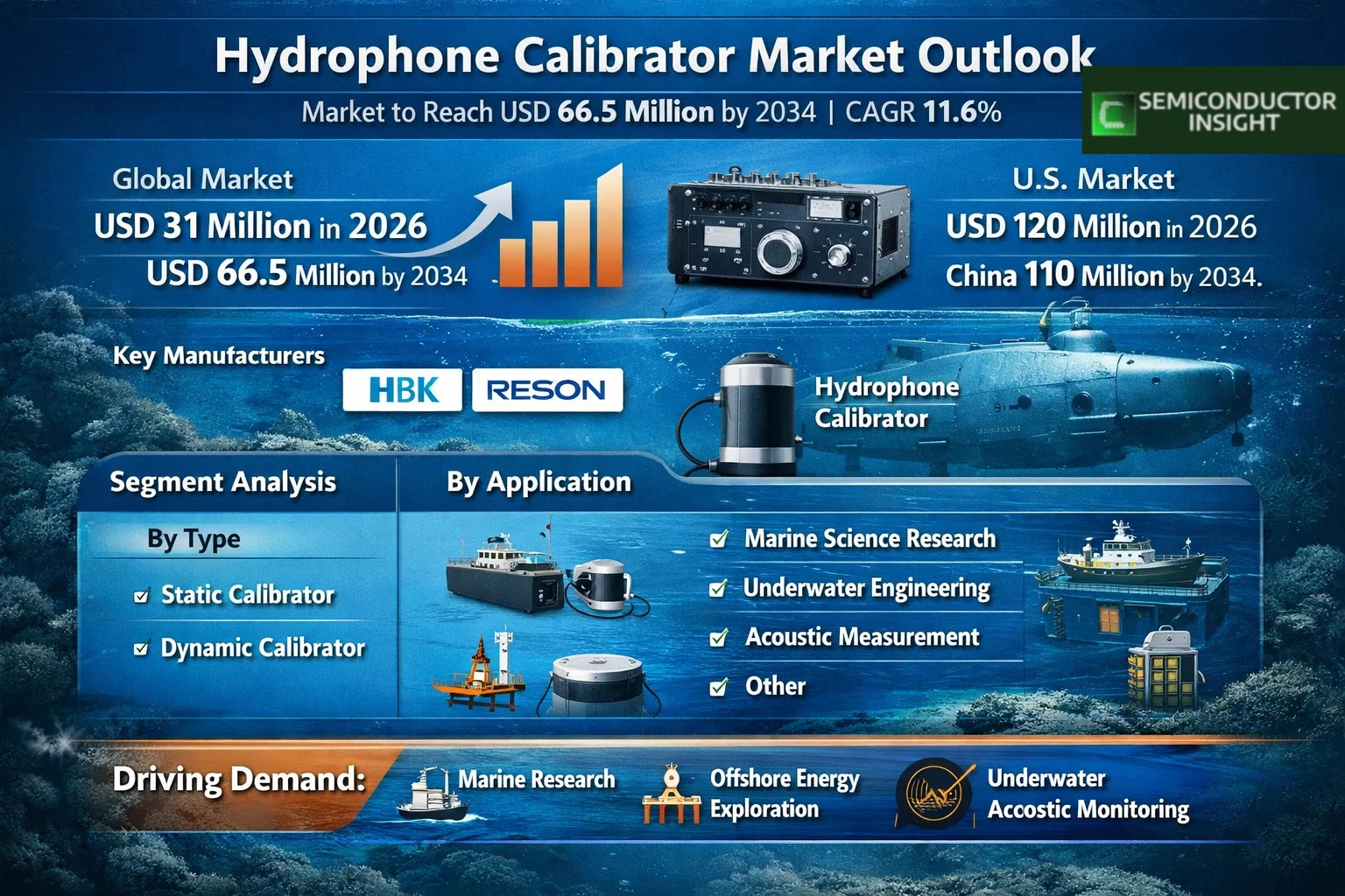 Global Hydrophone Calibrator Market was valued at USD 31 million in 2026 and is projected to reach USD 66.5 million by 2034, registering a CAGR of 11.6% during the forecast period. Market expansion is supported by rising investments in marine science, offshore energy exploration, and underwater acoustic monitoring programs. The U.S. market size was estimated at USD 120 million in 2026, while the China market is projected to reach USD 110 million by 2034, reflecting strong regional momentum in oceanographic and subsea engineering activities.