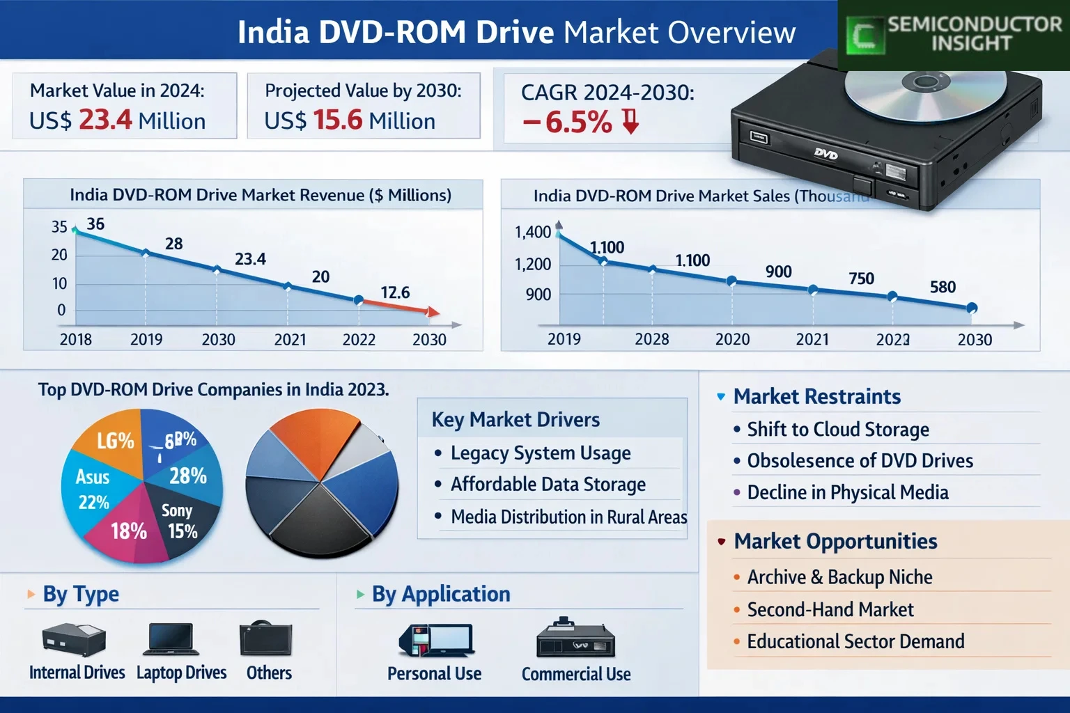 India DVD-ROM Drive Market was valued at USD 23.4 million in 2026 and is projected to reach USD 15.6 million by 2034, declining at a CAGR of –6.5% during the forecast period 2026–2034. This contraction reflects accelerating adoption of digital distribution channels, cloud storage solutions, and streaming services that have diminished demand for optical disc drives in both consumer and enterprise segments. Despite steady legacy demand in institutional and low-connectivity sectors, shrinking install bases in PCs and notebooks are key contributors to the ongoing market downturn.