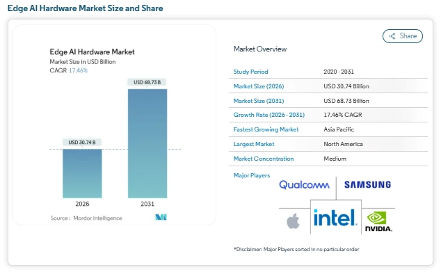 The edge AI hardware market size was valued at USD 26.17 billion in 2025 and is estimated to grow to USD 30.74 billion in 2026, with projections indicating it will reach USD 68.73 billion by 2031, registering a CAGR of 17.46% during the forecast period. This strong edge artificial intelligence hardware market growth reflects the rising adoption of local data processing capabilities that reduce latency, strengthen data privacy, and improve energy efficiency.