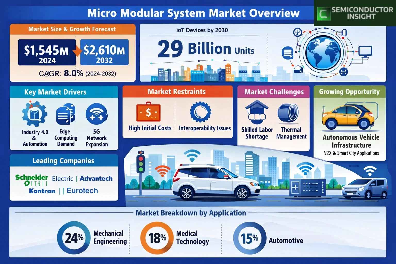 Global Micro Modular System Market was valued at USD 1,545 million in 2026 and is projected to reach USD 2,610 million by 2034, registering a CAGR of 8.0% during the forecast period 2026–2034. This growth trajectory reflects increasing demand across industries seeking scalable, flexible, and high-reliability computing frameworks to support industrial IoT, edge processing, and embedded system deployments. Rising digitalization across manufacturing, automotive, and medical sectors continues to strengthen long-term market fundamentals.