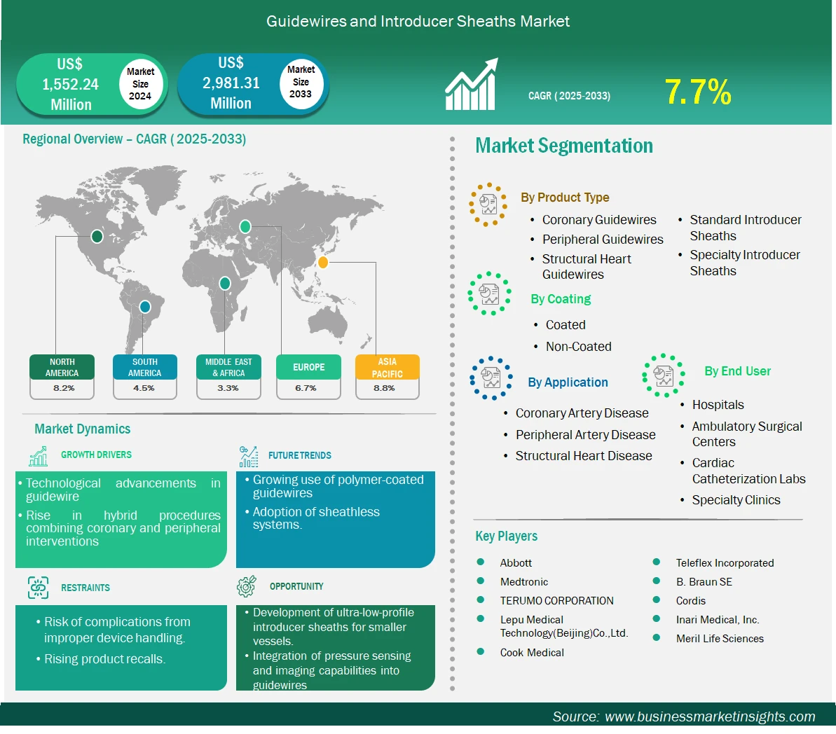 Major market leaders operating in the guidewires and introducer sheaths market include Medtronic, Abbott Laboratories, Medtronic plc, TERUMO CORPORATION, Lepu Medical Technology (Beijing) Co., Ltd., Cook Medical, Teleflex Incorporated, B. Braun SE, Cordis, Inari Medical, Inc., and Meril Life Sciences. These companies continue to expand their global presence through innovative product portfolios, strategic partnerships, and strong distribution networks.