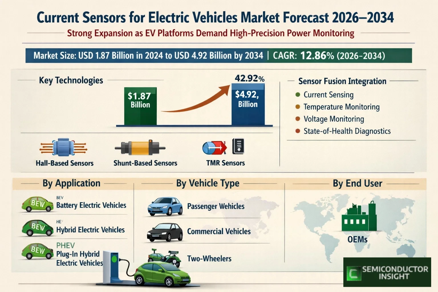 Global Current Sensors for Electric Vehicles Market was valued at USD 1.87 billion in 2024 and is projected to reach USD 4.92 billion by 2034, registering a CAGR of 12.86% during the forecast period 2026–2034. Market momentum is closely tied to accelerating electric vehicle adoption worldwide, alongside rising system complexity in battery management, motor control, and high-voltage charging architectures.