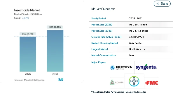 The Insecticide Market Size is estimated at USD 39.7 billion in 2026, rising from USD 38.33 billion in 2025 and projected to reach USD 47.34 billion by 2031, growing at a CAGR of 3.57%. Agriculture today faces dual pressure. Farmers must produce more food while land availability remains limited. As cropping intensity increases, pest attacks become more frequent and severe. The Insecticide Industry therefore remains closely tied to food security.