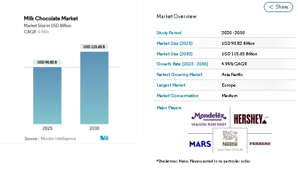 The Milk Chocolate Market Size is valued at USD 90.82 billion in 2025 and, according to the Milk Chocolate Market Forecast, is expected to reach USD 115.65 billion by 2030. The Milk Chocolate Industry remains one of the most stable segments within the global confectionery category. Demand comes from everyday snacking, seasonal gifting, and celebrations.