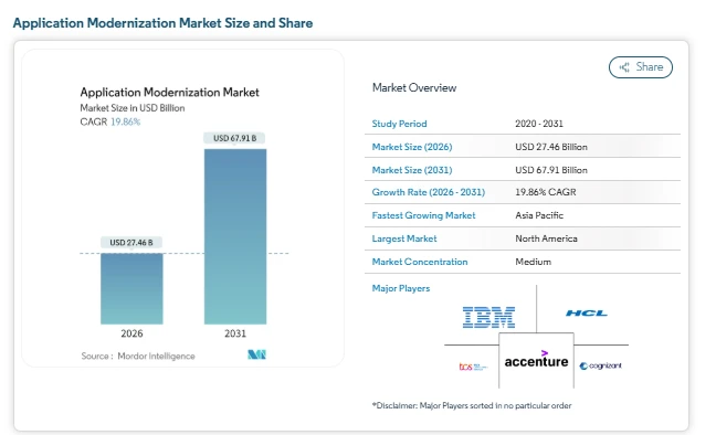 The application modernization market size is projected to grow from USD 22.91 billion in 2025 to USD 27.46 billion in 2026, highlighting the rapid pace of adoption across industries. Over the forecast period from 2026 to 2031, the market is expected to expand significantly, reaching USD 67.91 billion by 2031 at a robust compound annual growth rate (CAGR) of 19.86%.