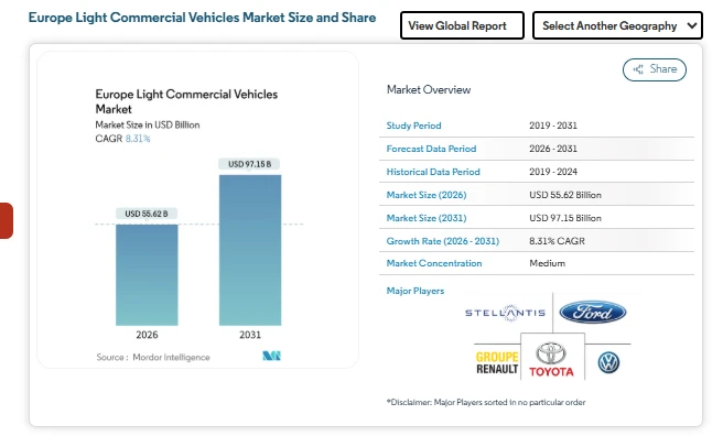 The Europe light commercial vehicles market size continues to play a central role in regional logistics, trade services, and urban mobility. According to Mordor Intelligence, the market was valued at USD 55.62 billion in 2026 and is projected to reach USD 97.15 billion by 2031, reflecting steady expansion during the forecast period. This outlook highlights how light commercial vehicles remain essential to delivery networks, utilities, construction, and public services across Europe.