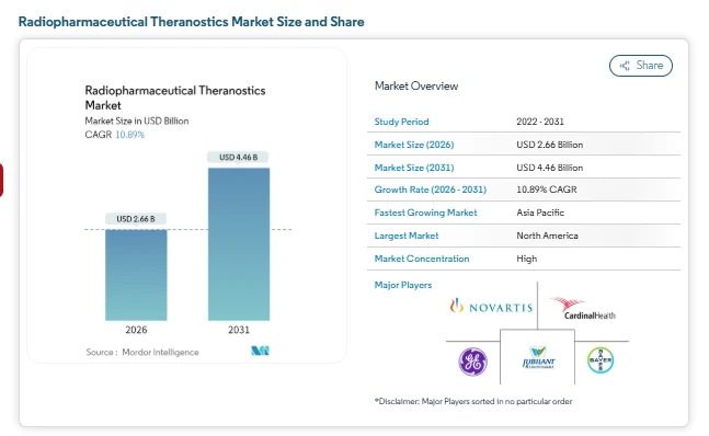 The radiopharmaceutical theranostics market is gaining steady clinical and commercial traction as oncology care increasingly favors targeted, image-guided treatment pathways. According to Mordor Intelligence, the radiopharmaceutical theranostics market size is projected to grow from USD 2.40 billion in 2025 to USD 2.66 billion in 2026, and further expand to USD 4.46 billion by 2031. This growth reflects rising confidence in radioligand therapies that combine precise diagnostics with tumor-directed radiation treatment.