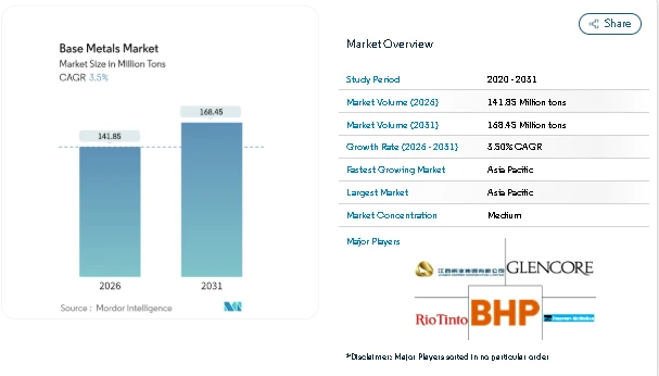 The Base Metals Market Size continues to expand as industrial demand remains steady across construction, transportation, and electrical applications. According to the report, the market reached 141.85 million tons in 2026 and is projected to grow to 168.45 million tons by 2031, supported by ongoing electrification, infrastructure upgrades, and wider use of recycled feedstock.
