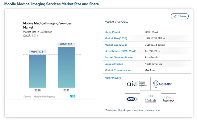 The mobile medical imaging services market continues to gain attention as healthcare systems worldwide focus on bringing diagnostic services closer to patients. According to Mordor Intelligence, the mobile medical imaging services market size was valued at  USD 17.31 billion in 2026, and is projected to grow further to USD 21.13 billion by 2031. This steady expansion reflects the growing role of mobile diagnostics in hospitals, clinics, and home-based care settings.