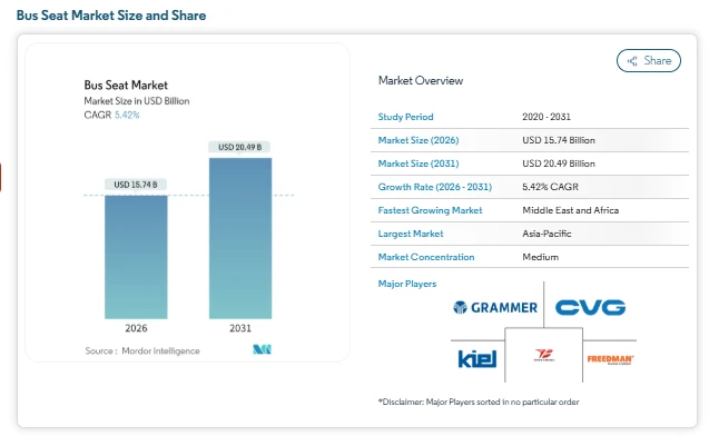 The global bus seat market is witnessing steady expansion as public transport authorities and fleet operators place greater focus on passenger comfort, safety compliance, and fleet electrification. According to Mordor Intelligence, the bus seat market size is projected to reach USD 20.49 billion by 2031, reflecting consistent bus seat market growth driven by investments in urban transit, electric buses, and retrofit programs. During the forecast period, the bus seat market forecast highlights rising demand across city transit, coach, and school bus applications, supported by evolving seating specifications and material preferences.