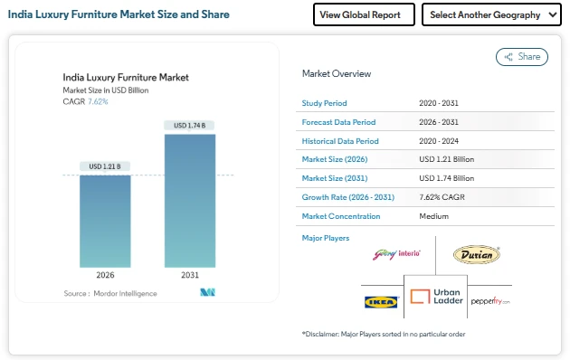 The India luxury furniture market size was valued at USD 1.12 billion in 2025 and is estimated to grow to USD 1.21 billion in 2026, reaching USD 1.74 billion by 2031 at a CAGR of 7.62%. This steady rise reflects sustained demand for premium home interiors, workplace upgrades, and hospitality expansion across major cities and emerging urban centers. The India luxury furniture industry continues to benefit from rising disposable income, wealth creation, and growing interest in lifestyle-oriented interior solutions.