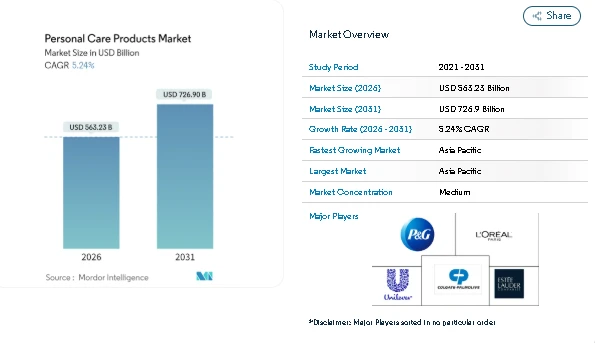 The Personal Care Products Market continues to expand steadily as grooming, hygiene, and daily wellness routines become part of regular consumer lifestyles across regions. According to industry analysis, the Personal Care Products Market Size is estimated at USD 563.23 billion in 2026 and is expected to reach USD 726.9 billion by 2031, showing consistent demand across both developed and emerging economies.
