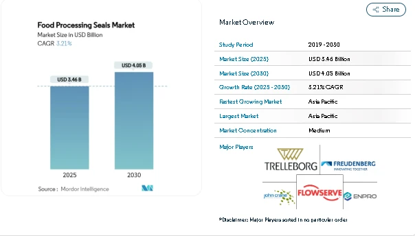 The Food Processing Seals Market is experiencing steady growth, driven by the increasing demand for hygiene, safety, and efficiency in food production processes. The market size is projected to reach USD 4.05 billion by 2030, up from USD 3.46 billion in 2025, reflecting a moderate growth trajectory during the forecast period.