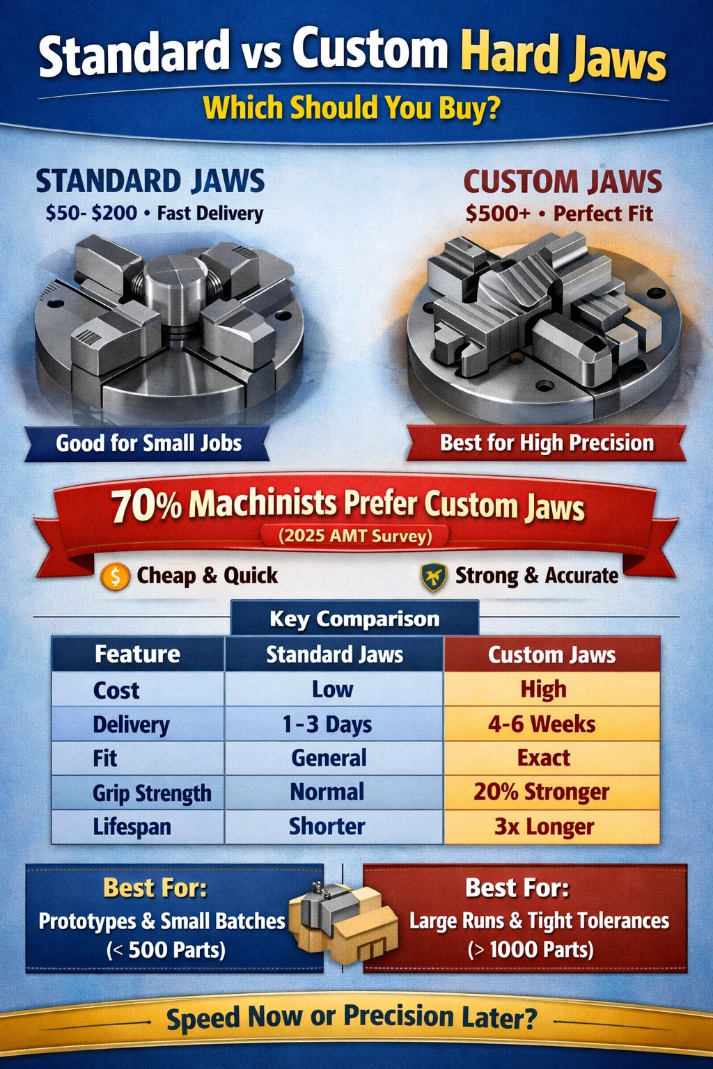 A 2025 AMT survey found that 70% of machinists reported better holding power with custom jaws. But custom jaws cost more and take longer to make.