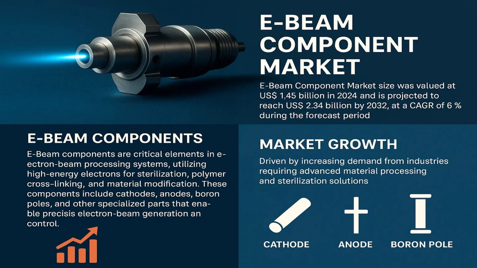 Global E-Beam Component Market was valued at USD 1.45 billion in 2026 and is projected to reach approximately USD 2.34 billion by 2034, registering a CAGR of 6.2% during the forecast period 2026–2034. Market expansion is supported by rising adoption of electron-beam processing across sterilization, polymer modification, and precision manufacturing, indicating steady medium-term growth.