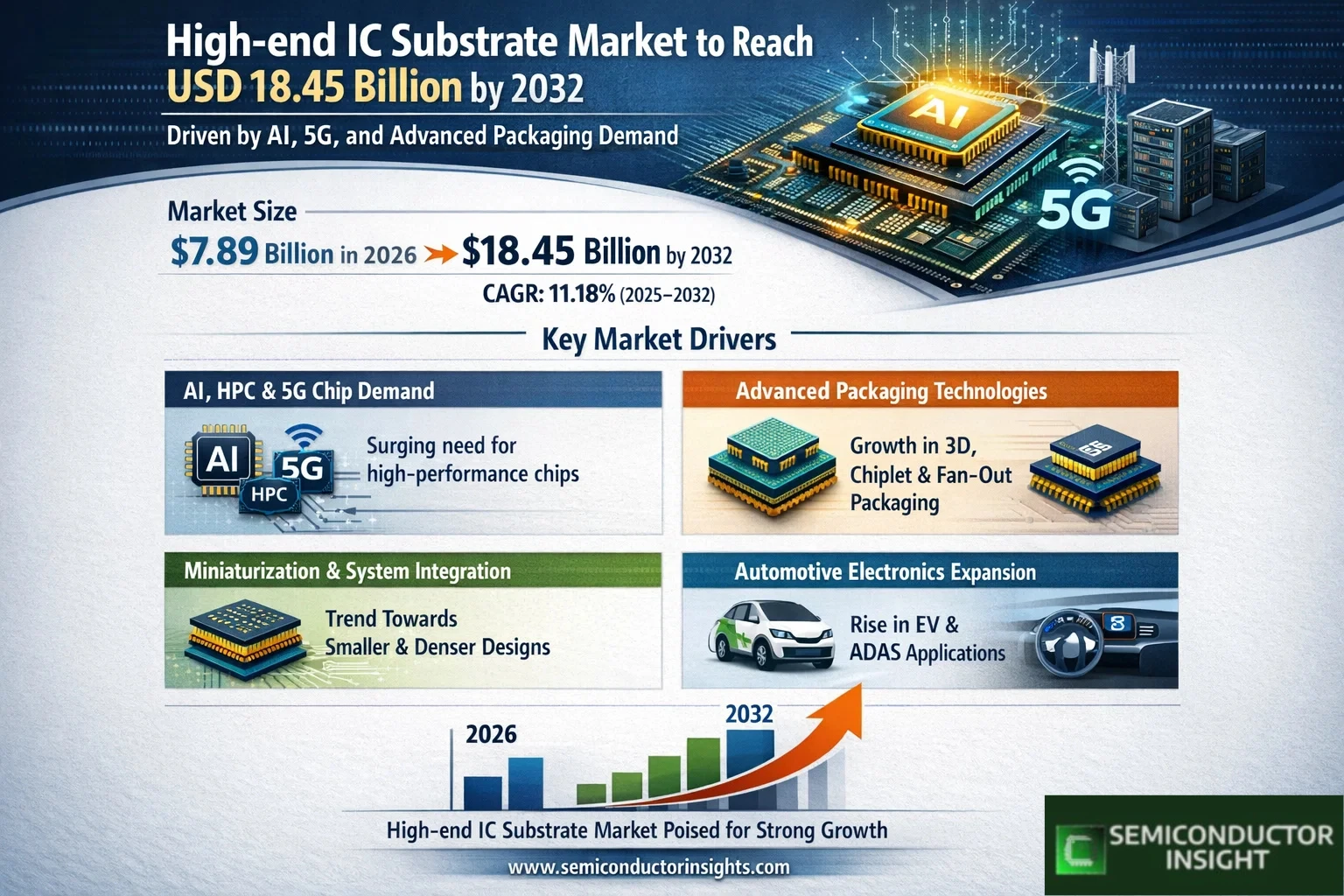 Global High-end IC Substrate Market was valued at USD 7.89 billion in 2026 and is projected to reach USD 18.45 billion by 2032, registering a CAGR of 11.18% during the forecast period 2025–2032. Strong growth is being driven by rising demand for high-performance chips used in artificial intelligence, 5G infrastructure, data centers, and advanced automotive electronics, alongside rapid adoption of next-generation packaging technologies.
