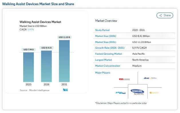 The walking assist devices market size continues to gain steady attention as healthcare systems, families, and care providers focus on restoring everyday mobility and independence. According to the Mordor Intelligence analysis, the market is valued at  USD 8.41 billion in 2026, and is projected to reach USD 11.23 billion by 2031. This outlook reflects a clear shift in how walking aids are viewed, moving beyond hospital-only equipment toward daily-use mobility solutions across clinical and home settings.