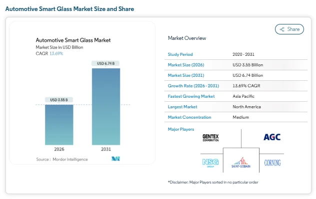 The automotive smart glass market is entering a decisive growth phase as automakers focus on cabin comfort, energy efficiency, and advanced vehicle design. According to Mordor Intelligence, the automotive smart glass market size is estimated at USD 3.55 billion in 2026, and projected to reach USD 6.74 billion by 2031, supported by a 13.69% CAGR during the forecast period.
