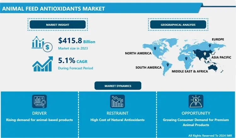 Animal Feed Antioxidants Market Size Was Valued at USD 415.8 Billion in 2023, and is Projected to Reach 612.23 USD Billion by 2032, Growing at a CAGR of 5.1 % From 2024-2032.