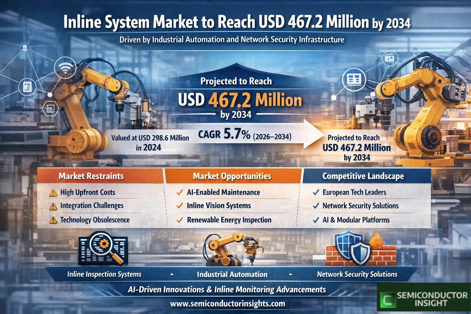 Global Inline System Market was valued at USD 298.6 million in 2024 and is projected to reach USD 467.2 million by 2034, registering a CAGR of 5.7% during the forecast period 2026–2034. Market growth is progressing steadily as industrial automation, inline inspection, and network security infrastructure expand across manufacturing and digital operations environments.