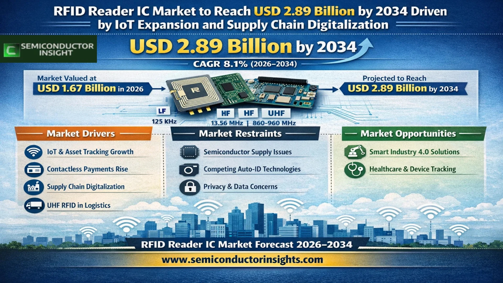Global RFID Reader IC market was valued at USD 1.67 billion in 2026 and is projected to reach USD 2.89 billion by 2034, registering a CAGR of 8.1% during the forecast period 2026–2034. Market growth is progressing steadily as RFID-based identification and tracking systems gain wider deployment across retail, logistics, healthcare, and industrial IoT environments.