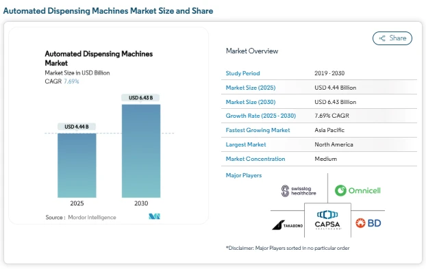 The automated dispensing machines market size is valued at USD 4.44 billion in 2025 and is projected to reach USD 6.43 billion by 2030, registering a CAGR of 7.69% during the forecast period. The rising need to improve medication safety, reduce manual errors, and enhance pharmacy workflow efficiency is shaping the automated dispensing machines market forecast globally.