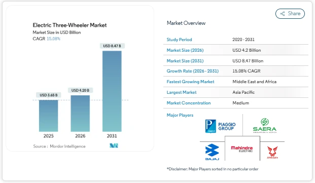The electric three-wheeler market size was valued at USD 4.2 billion in 2026 to reach USD 8.47 billion by 2031, registering a CAGR of 15.08% during the forecast period. The electric three-wheeler market size is expanding steadily as governments, fleet operators, and financing institutions support the transition toward electric mobility.