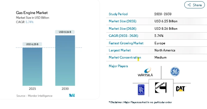 The global Gas Engine Market is set to experience steady growth, with the market size estimated at USD 6.25 billion in 2026 and projected to reach USD 8.26 billion by 2031. This growth is driven by increasing adoption of gas engines across industrial, utility, and distributed energy applications, as well as favorable policies supporting cleaner energy alternatives.